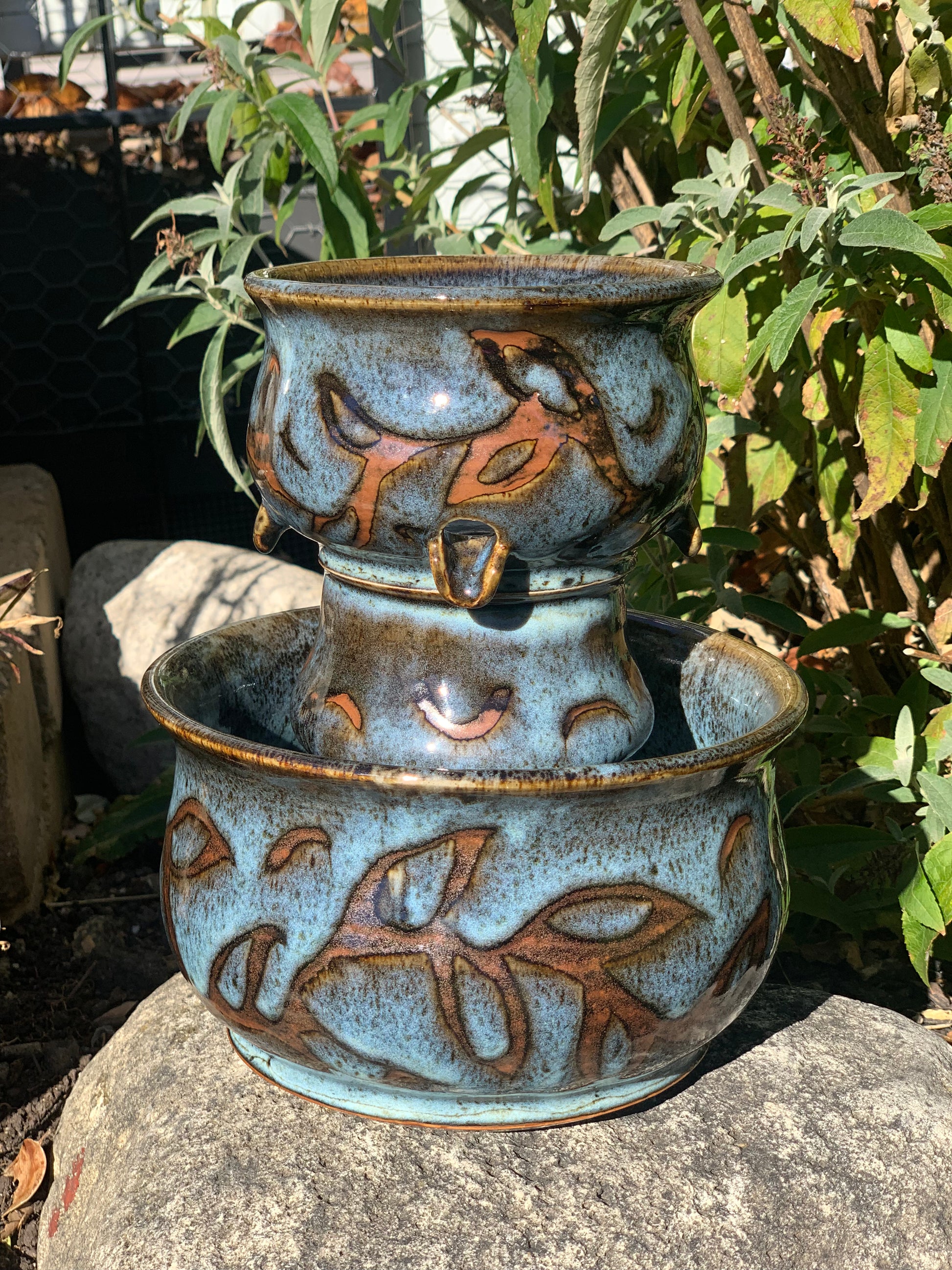 A miniature water fountain with four spouts that can either be decorative or functional. Water pump not included. Leafy vine design painted by hand and has a blue/bronze glaze inside and outside the vessel.